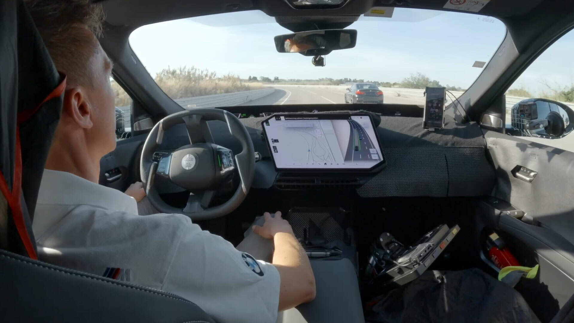 内饰方面,新车虽然没有在此次原型车展示中完全披露座舱设计,但部分关键控件已经清晰可见了。车辆采用了特殊样式的方向盘,多功能控制依旧布局在左右两侧,但方向盘的支撑辐条从横向变为了纵向,圆盘两侧还带有特殊的手握结构与对应装饰。同时,车辆预计会采用与此前CES展上相同的3D抬头显示系统(又称BMW全景视域桥,投影画幅为40英寸、分辨率为4K)来取代传统仪表;而17.9英寸中央触控屏虽依旧为悬浮式布局,但却为了不规则六边形样式,这也与此前的X概念车如出一辙。